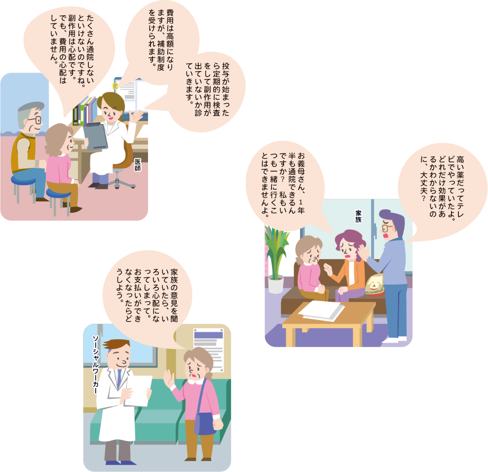 葛藤しているのは、患者さんだけではありません。ご家族も、「本人の思いを大切にしたい」一方で「治療機会を大切にしたい」という葛藤、通院付き添いとご自身の生活の両立の不安などを抱え、気持ちが揺れることがあります。