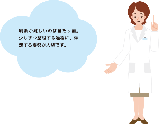 多くの方にとって、診断を受けるという決断そのものが、すでに大きな選択です。治療の選択について、結論を急がせず、迷ったり、ご家族と相談する時間をとることができる環境を提供することが大切です。