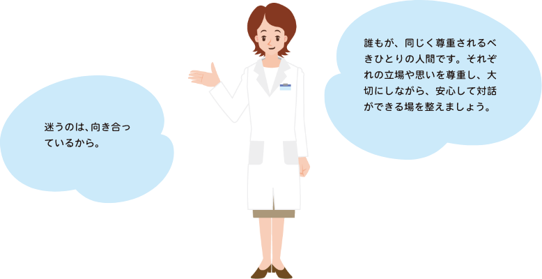 「一緒に考えていきましょう」という姿勢を示します。初めて経験する事態を前にして、考えをまとめたり、感情を言葉にすることが難しくなることがあります。言語化するために、専門家の助けが必要なことがあります。