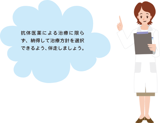 抗体医薬による治療の適応外となる可能性もあります。「抗体医薬の適応があってもなくても、支援は続く」ことを最初から示し、先行きが見えない不安に配慮します。